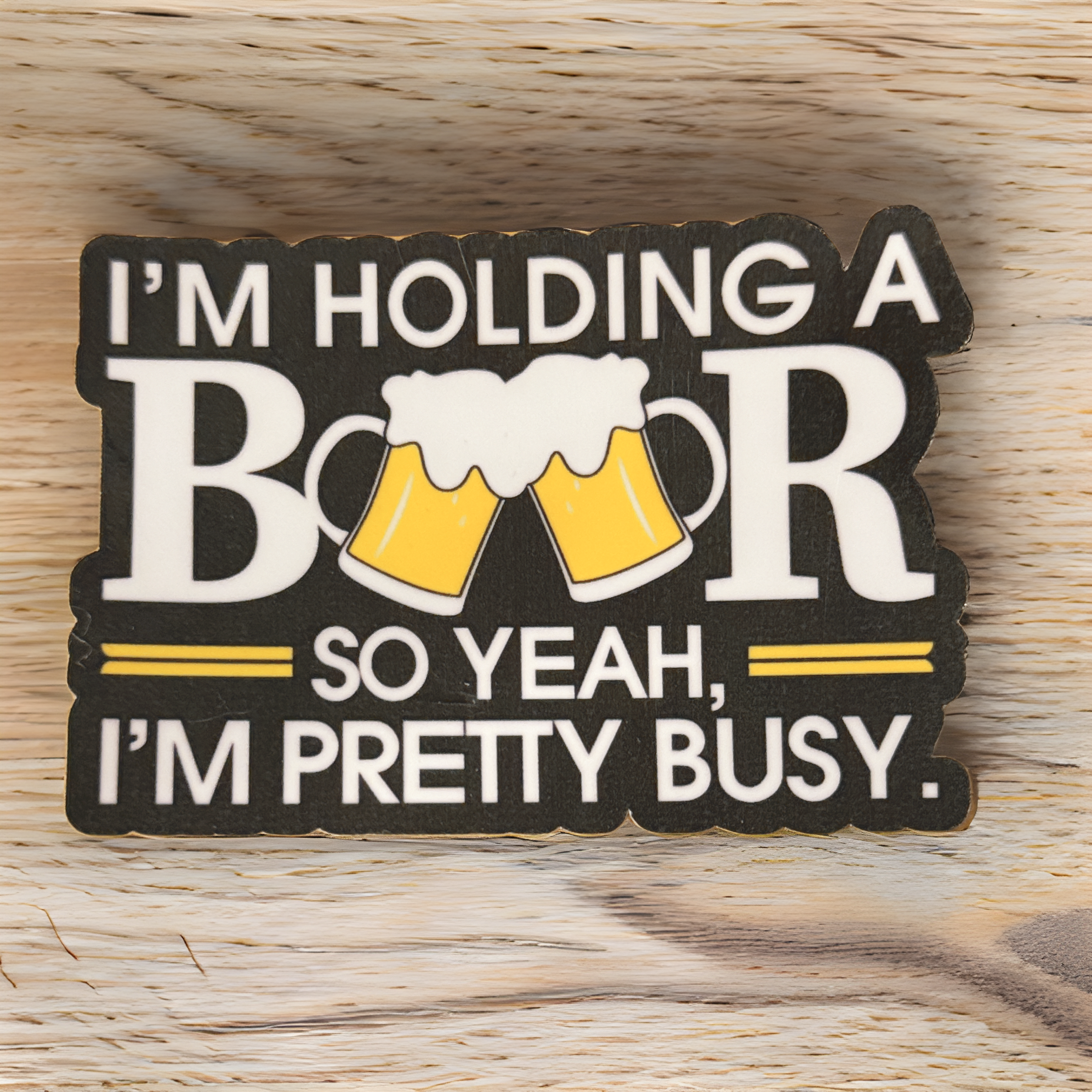 Never worry about missing a moment to enjoy your beer with this "Busy Holding a Beer" 3" Sticker! Let it remind you that the most important thing in life is to finish your drink! Tag it on your fridge, laptop, or water bottle to bring a little humor into your day and to keep you on task!